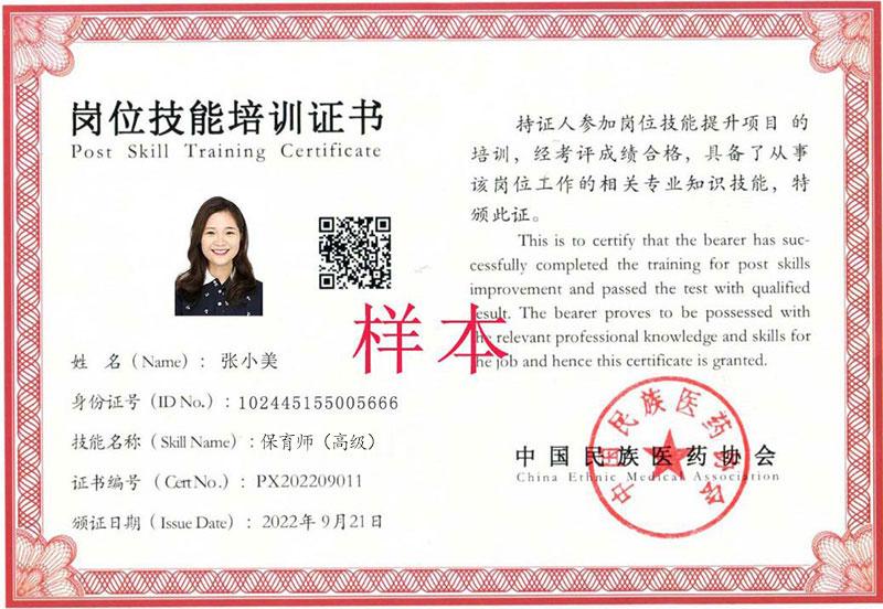 培训考试合格,颁发中国民族医药协会保育师(高级)岗位技能证书。