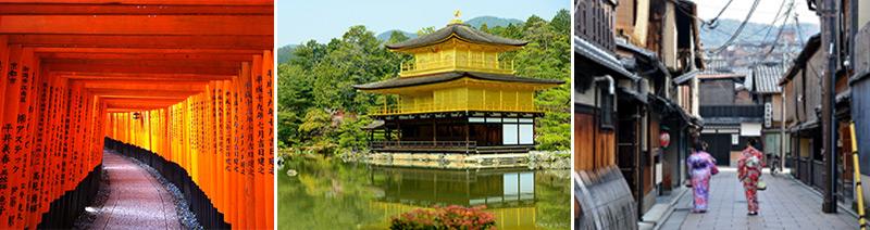金阁寺本名是鹿苑寺,由于寺内核心建筑舍利殿的外墙全部贴以金箔装饰,故昵称为“金阁寺”。寺院始建于1397年,原为足利义满将军(即动画《聪明的一休》中利将军的原型)的山庄,后改为禅寺“菩提所”。据说以金阁为中心的庭园为“极乐净土”,与寺前的镜湖池相互辉映,尤其在晴天风景极好,而这也成为了京都的象征。春秋两季是金阁寺的旅游旺季,但实际上这里的景致一年四季皆有不同美貌,无论是深秋的似火红叶还是冬季的白雪银装,都映衬出金阁寺的别致,令人着迷。